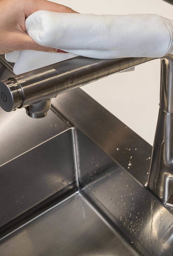 Затем смочите в полученном растворе салфетку, лучше всего тканевую. Затем оберните смоченную ткань вокруг загрязненной вещи и оставьте примерно на полчаса. Затем хорошо промойте кран теплой водой. Тщательно протрите кран кухонной тряпкой.